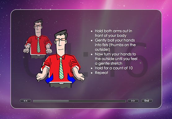 I used this software extensively when I was spending 4-6 hours a day writing my thesis. It offers a good variety of stretches and ergonomic tips. It also monitors the intensity of your activity; if you’re mousing around a lot or furiously typing to beat a deadline, it will pop up a reminder to take a micro-break of a few seconds. It nags because it loves. It’s more expensive ($25) than most shareware, but worth it if you spend a lot of time on the ‘puter.